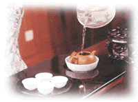 3、傾心桃源(置茶于壺內(nèi)):俗稱“納茶”,即將茶葉投入茶壺,取樣要準確,量多則過濃,量少則偏淡。通常下茶量以茶水比1:22為宜。