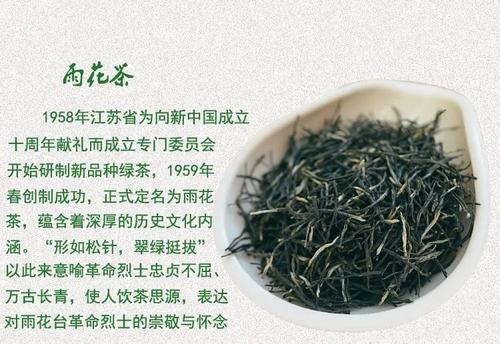 南京雨花茶是綠茶炒青中的珍品,也是中國三針之一,即:安化松針(半烘半炒),南京雨花(炒青),恩施玉露(蒸青),是優(yōu)質細嫩針狀春茶,產(chǎn)于南京中山陵,雨花臺園林風景區(qū),因此得名“雨花茶”。 雨花茶創(chuàng)制于1958年,是60年底代我國綠茶中嶄露頭角的新品名茶。