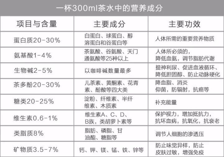 據(jù)科學(xué)家分析和鑒定,茶葉中含有300多種對人體有益的化學(xué)成分。其中包含大量的蛋白質(zhì)、氨基酸、脂肪、碳水化合物、礦物質(zhì)、微量元素以及維生素,其中維生素多達(dá)10余種,泡茶時(shí)多數(shù)可溶解在水中,能被充分利用。