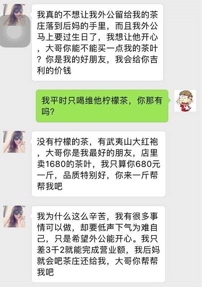 這個(gè)時(shí)候,騙子十有八九會(huì)出現(xiàn)跟你說(shuō)失戀的情況,哭的傷心欲絕,然后跟你傾訴,讓你憐香惜玉,之后會(huì)跑到武夷山爺爺奶奶或者外公外婆家中療傷,幫忙種茶炒茶,學(xué)會(huì)炒茶葉后決定自立自強(qiáng),開創(chuàng)自己的事業(yè) —— 炒茶葉,賣茶葉。