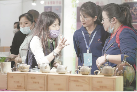 一位臺灣參展商(左)在介紹公司生產的特色茶具。 本報記者 王毅 攝