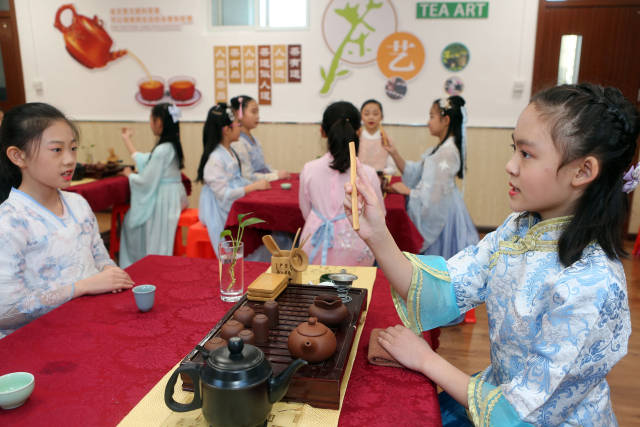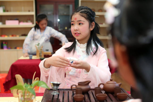 日前,天津市和平區(qū)哈密道小學(xué)舉行“以華服之美,致敬茶事之道”校園茶藝展示活動,組織學(xué)生們進(jìn)行茶服和茶藝展示,在校園里弘揚傳統(tǒng)文化。