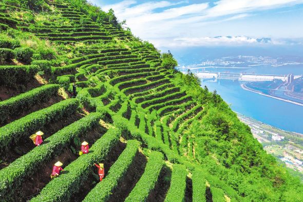 宜昌市夷陵區(qū)三斗坪鎮(zhèn)黃牛巖農民利用梯田建設青云頂茶山小鎮(zhèn),發(fā)展農旅融合產業(yè),讓游客體驗茶文化、觀賞大壩勝景。(湖北日報全媒記者 陳勇 攝)