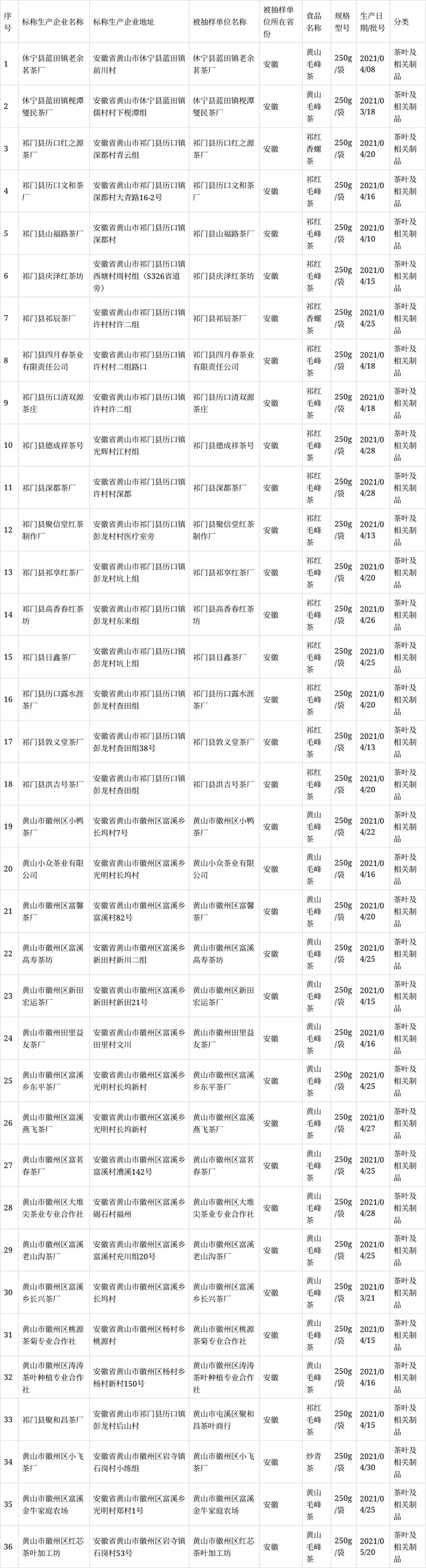 安徽省黃山市市場(chǎng)監(jiān)管局公布36批次茶葉及相關(guān)制品抽檢結(jié)果