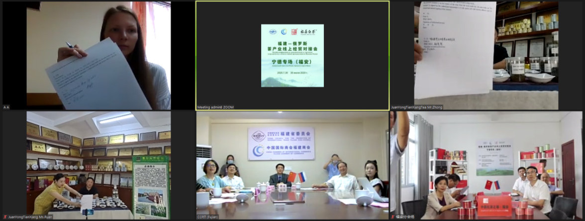 7月30日下午,由中國國際貿(mào)易促進委員會福建省委員會、中國國際商會福建商會、寧德市人民政府、俄羅斯國家工商會、俄羅斯下諾夫哥羅德州工商會聯(lián)合主辦,寧德市貿(mào)促會、福安市人民政府、福鼎市人民政府、21世紀海上絲綢之路商務(wù)理事會福建聯(lián)絡(luò)辦公室承辦,福安市貿(mào)促會、福鼎市貿(mào)促會、福安市茶業(yè)管理局、21世紀海上絲綢之路商務(wù)理事會福建聯(lián)絡(luò)辦公室武夷山工作站、福建世創(chuàng)商務(wù)展覽有限公司執(zhí)行承辦的“福建—俄羅斯茶產(chǎn)業(yè)線上經(jīng)貿(mào)對接會寧德專場(福安)”通過跨境會議系統(tǒng)平臺成功舉行。省貿(mào)促會傅健副會長、陳揚副會長、楊立云秘書長,以及聯(lián)絡(luò)部、貿(mào)易投資促進部、事業(yè)發(fā)展部負責(zé)人在省貿(mào)促會主會場出席了專場對接會。來自俄羅斯等獨聯(lián)體國家的近50名境外商協(xié)會、經(jīng)貿(mào)促進機構(gòu)代表和采購商,以及17家寧德等地優(yōu)質(zhì)茶企一同參加線上對接活動。