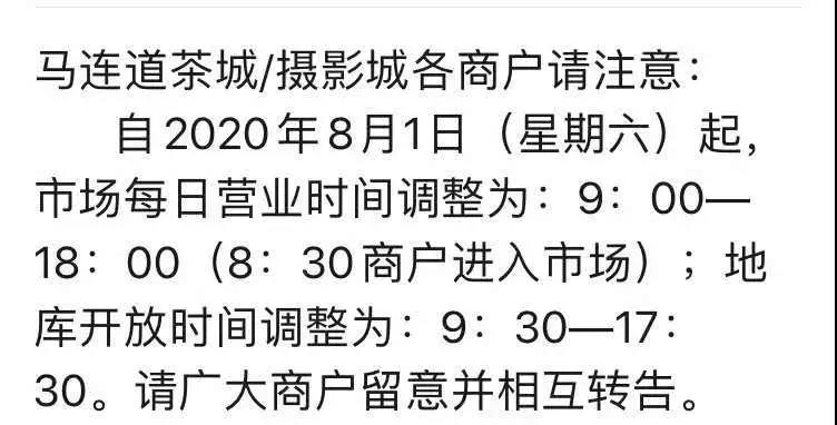 7月29日,北京市馬連道茶城管委會向所轄茶城下發(fā)通知:8月1日起,馬連道茶城每日營業(yè)時間將調(diào)整為9:00-18:00,地庫開放時間調(diào)整為9:30-17:30。至此,馬連道茶葉一條街終于全面恢復(fù)正常營業(yè)。
